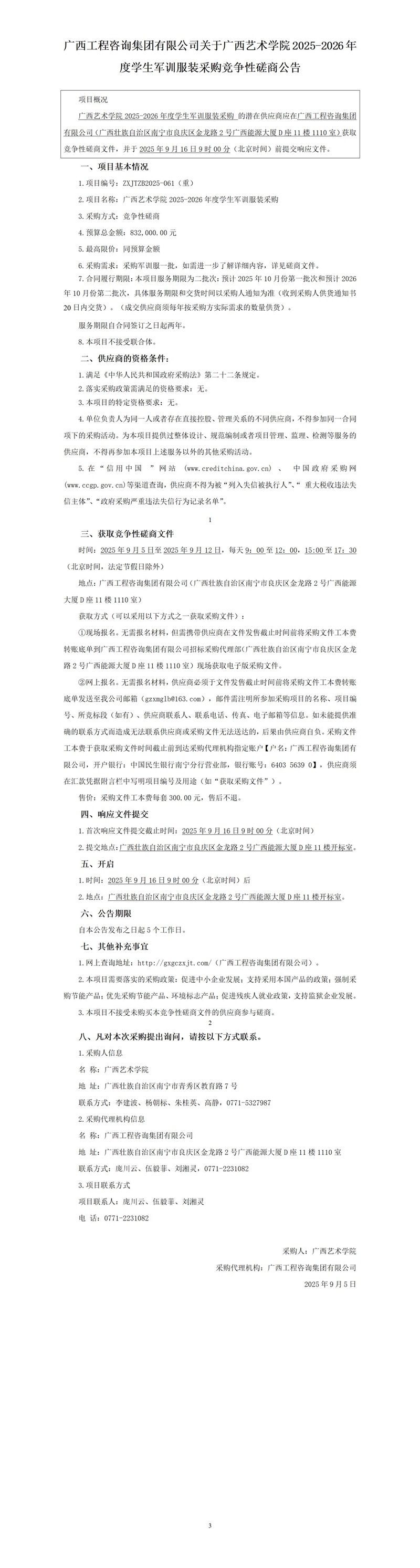 廣西工程咨詢集團有限公司關(guān)于廣西藝術(shù)學(xué)院2025-2026年度學(xué)生軍訓(xùn)服裝采購競爭性磋商公告