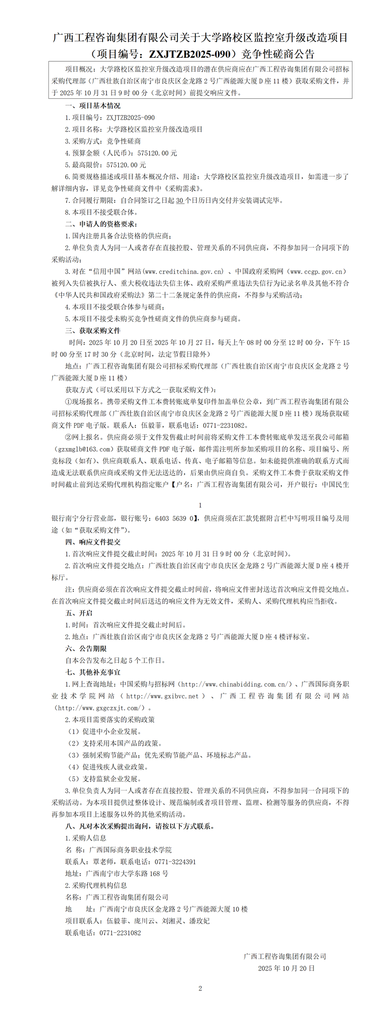廣西工程咨詢集團(tuán)有限公司關(guān)于大學(xué)路校區(qū)監(jiān)控室升級改造項(xiàng)目(項(xiàng)目編號:ZXJTZB2025-090)競爭性磋商公告