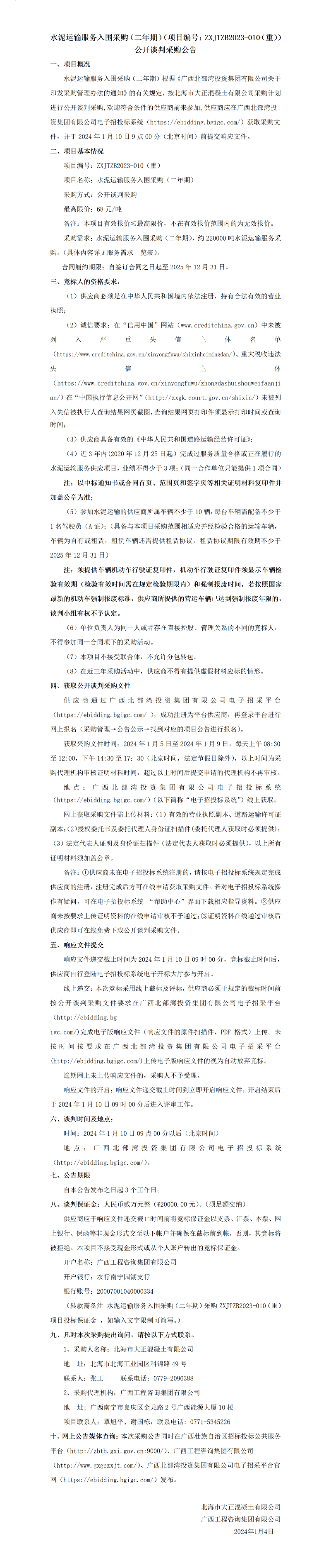 水泥運輸服務入圍采購(二年期)(項目編號:ZXJTZB2023-010(重)) 公開談判采購公告